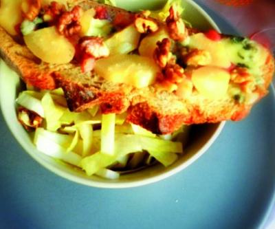 TARTINE DE ROQUEFORT ET POIRE SUR LEUR LIT D’ENDIVES ET NOIX